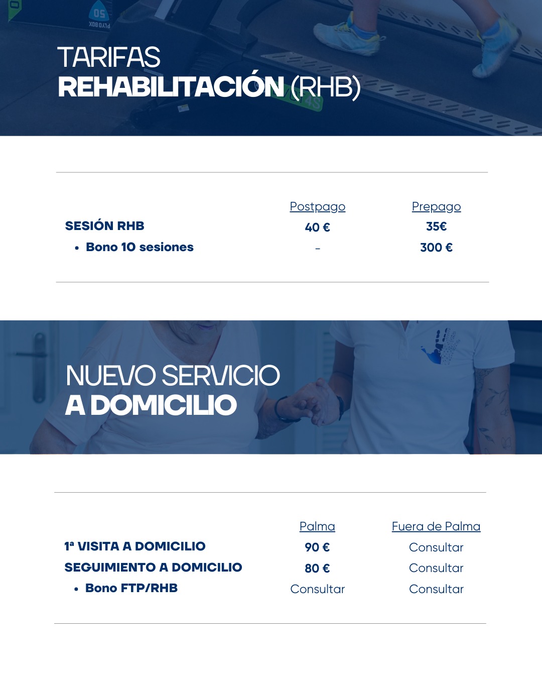 Con el objetivo de seguir ofreciendo un servicio riguroso, actualizado y centrado en cada paciente, presentamos la nueva tabla de precios de Fisioterapia, Rehabilitación (RHB) y Servicios a Domicilio.